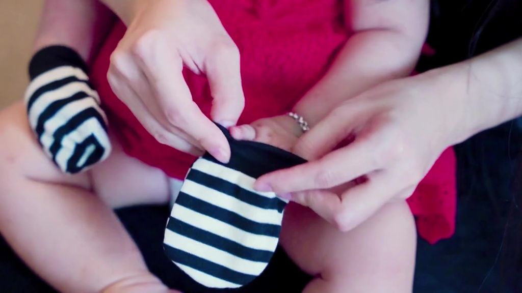 Nếu bạn đeo găng tay màu đen và trắng lên tay bé, bé có thể bắt đầu chú ý đến bàn tay của mình sớm hơn bình thường. Khám phá bàn tay là một bước quan trọng trên con đường kiểm soát bàn tay và nhận thức về cơ thể.
