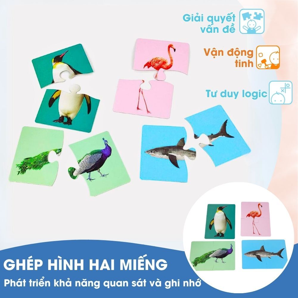 Ghép Hình Hai Miếng là bộ đồ chơi giáo dục yêu cầu trẻ sắp xếp và kết hợp các mảnh ghép để hoàn thành bức tranh các con vật mà trẻ yêu thích. Hoạt động này giúp trẻ phát triển toàn diện nhiều kỹ năng: vận động tinh, phân loại theo hình ảnh và màu sắc, ghi nhớ, tư duy, và giải quyết vấn đề.