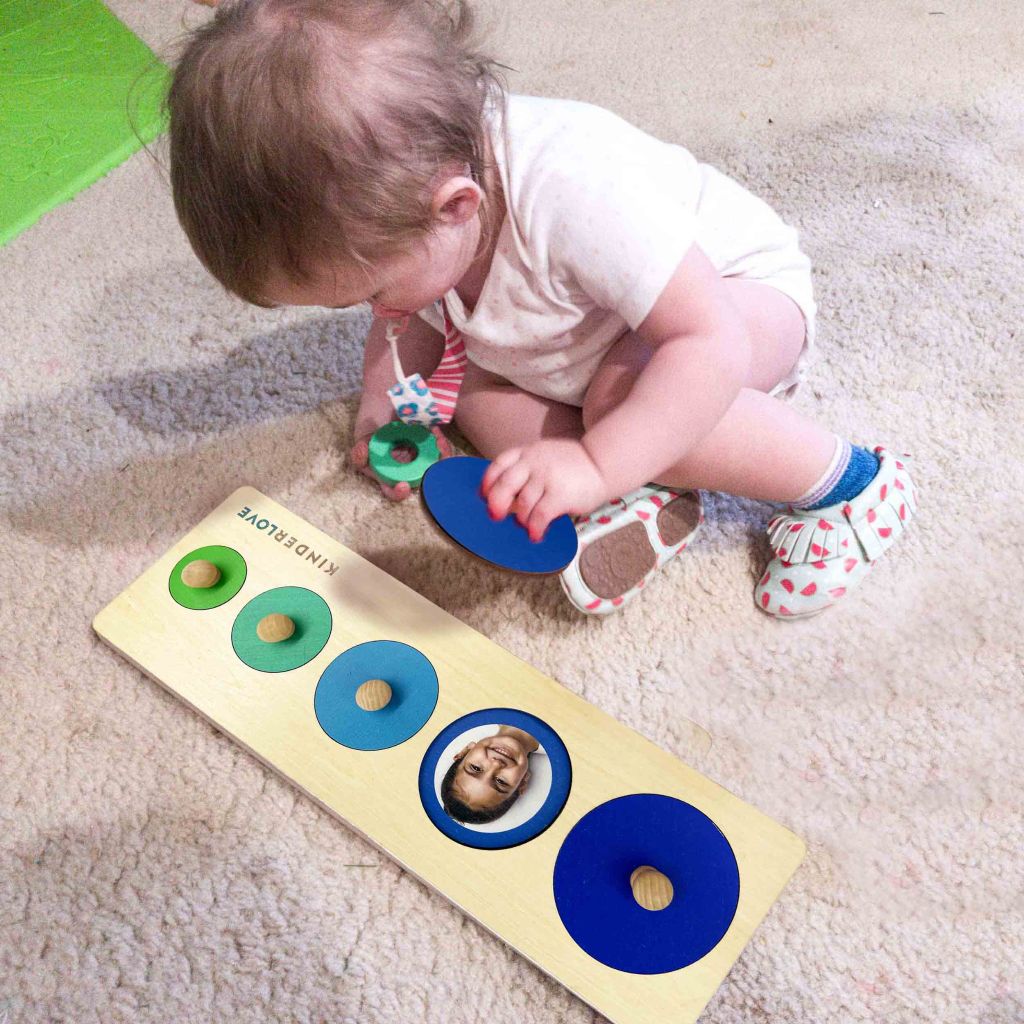 Ba mẹ hãy đặt tất cả các miếng ghép vào khung và hướng dẫn trẻ cách lấy chúng ra. Trẻ sẽ tập cách lấy miếng ghép ra trước khi gắn chúng vào khung.