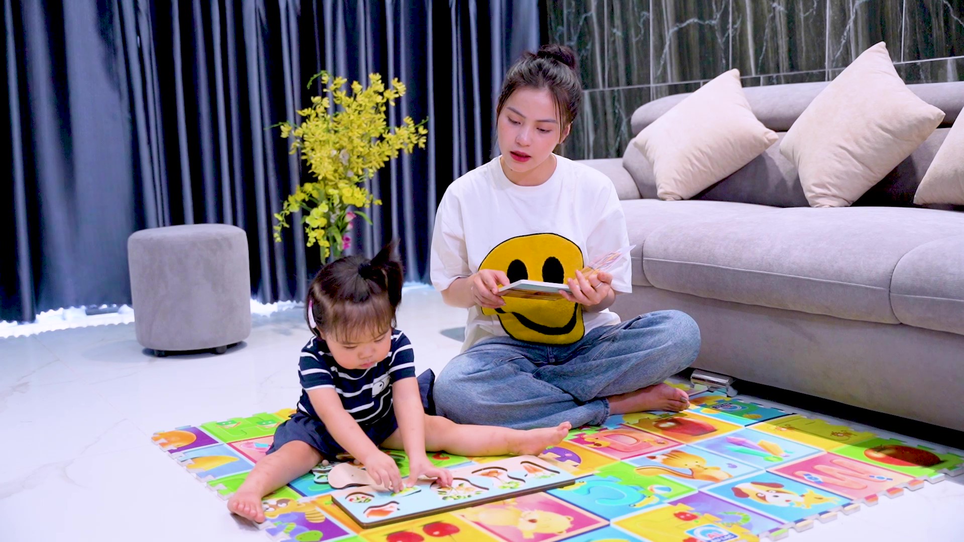 Chỉ cho trẻ cách cầm nhón những miếng ghép, lấy chúng ra và lắp chúng vào. Trẻ sẽ có thể lấy miếng ghép ra trước khi học cách lắp chúng vào lại.