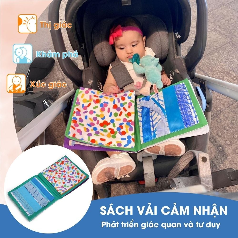Sách Vải Cảm Nhận là đồ chơi cho trẻ sơ sinh có màu sắc bắt mắt kết hợp nhiều chất liệu vải mềm mại giúp bé phát triển thị giác, thính giác, khuyến khích sự tò mò và khám phá đồ vật thông qua xúc giác. Chi tiết