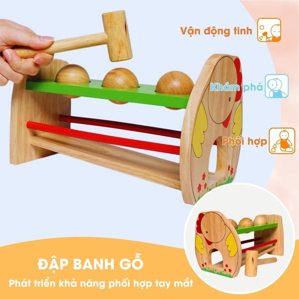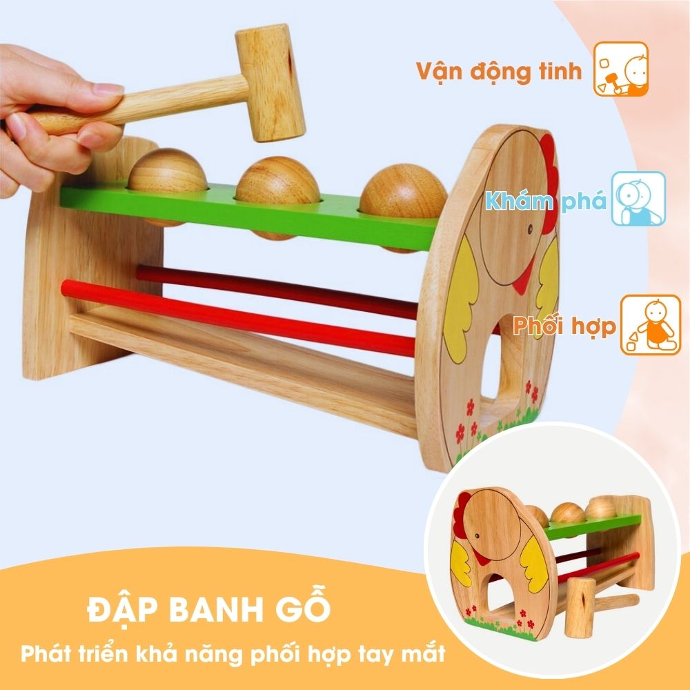 Đập Bóng Gỗ là món đồ chơi vận động kinh điển, được thiết kế theo hình ảnh chú gà đẻ trứng vô cùng dễ thương. Bé dùng búa để đập lần lượt các quả bóng gỗ rơi xuống rãnh và lăn ra ngoài - tạo nên âm thanh vui tai và khoảnh khắc háo hức mỗi lần chơi. Đây là trò chơi tuyệt vời giúp bé rèn luyện cơ tay, sự khéo léo và khả năng quan sát trong từng thao tác. Chi tiết