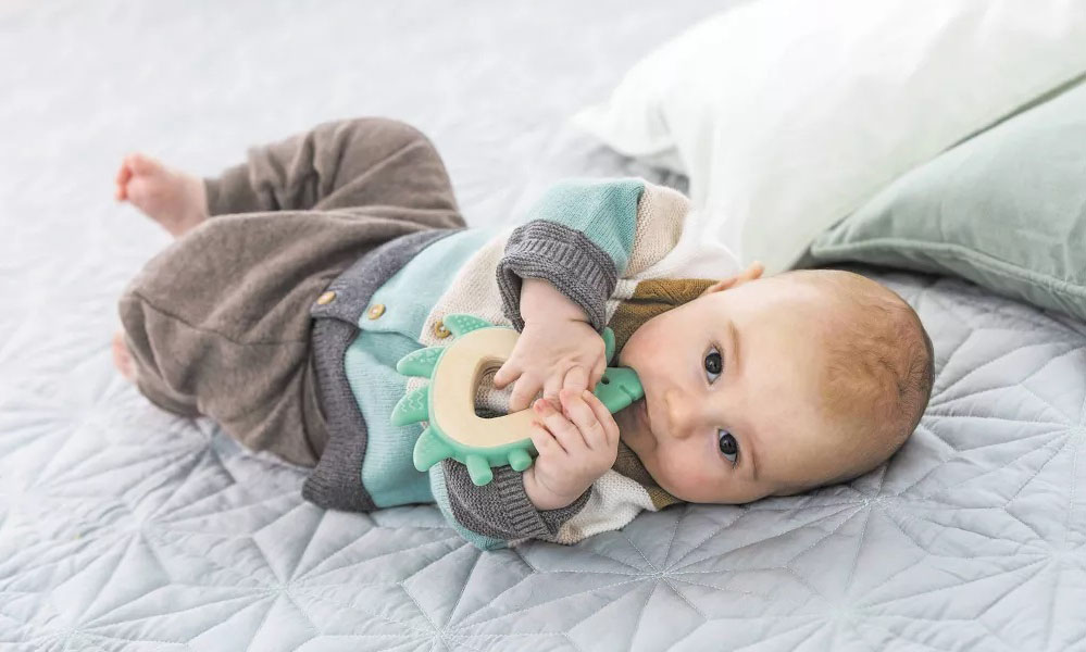 Việc cho trẻ chơi vòng gặm sẽ giúp trẻ học cách đóng mở bàn tay một cách chủ động hơn. Khuyến khích trẻ thực hiện các động tác này để phát triển kỹ năng cơ bản.